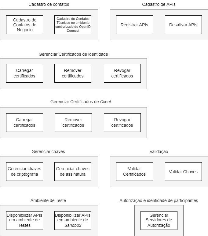 Nessa área os desenvolvedores encontrarão informações para observância obrigatória de todos os participantes, sejam eles obrigatórios ou voluntários, incluindo padrões técnicos de interfaces, glossário de termos técnicos, especificações dos diferentes tipos de APIs - incluindo seu versionamento, requisitos não funcionais como SLAs e limites de tráfego de requisições, informações de desempenho e disponibilidade, FAQ com diversas orientações aos desenvolvedores, entre outros elementos necessários à implementação do Sistema Financeiro Aberto. Todas as informações foram definidas de acordo com a regulamentação vigente no País, respeitando instruções normativas e resoluções do Banco Central do Brasil e do Conselho Monetário Nacional.
